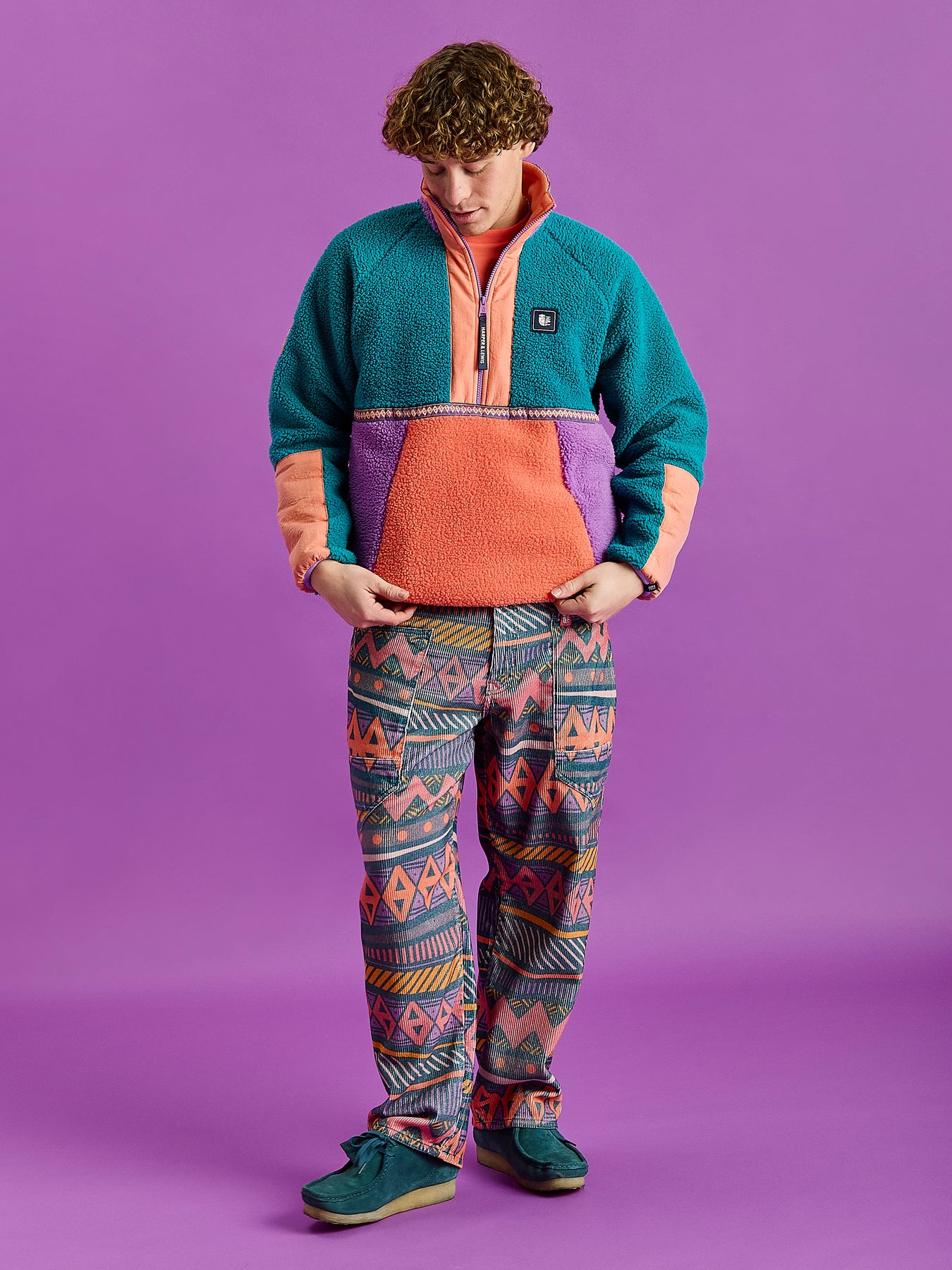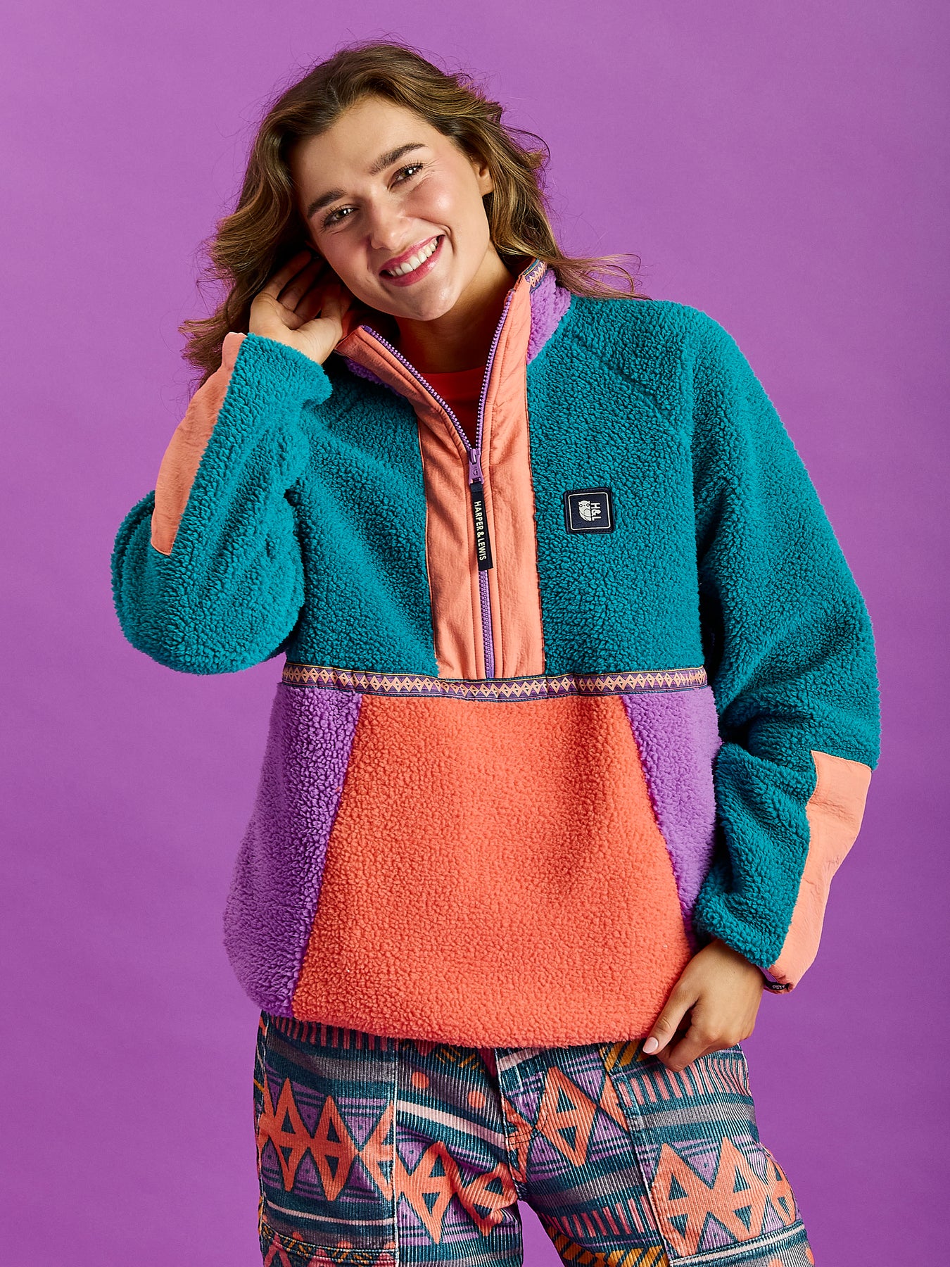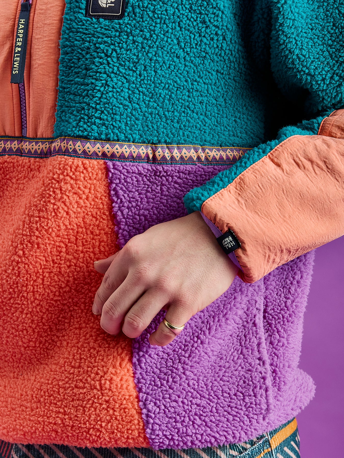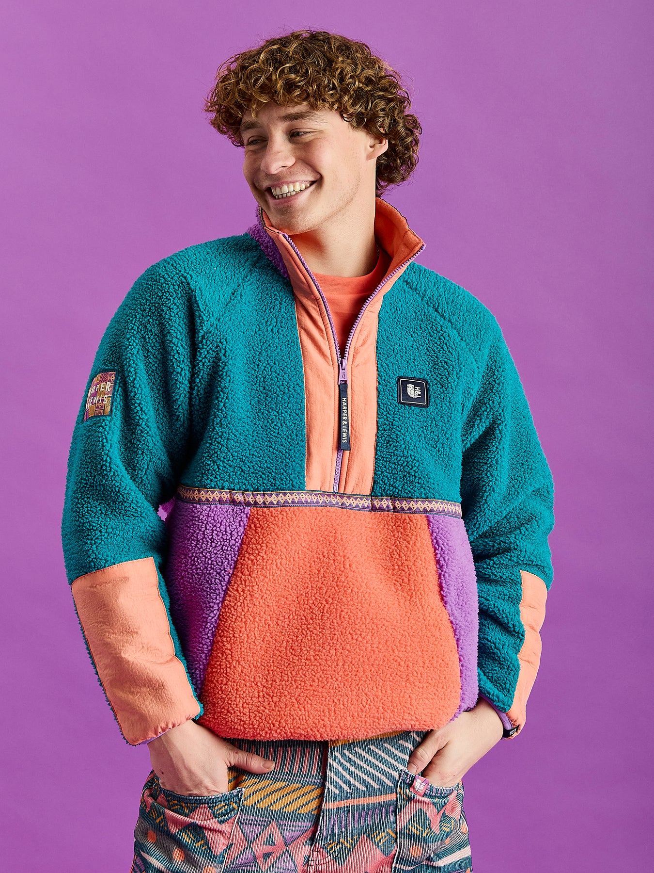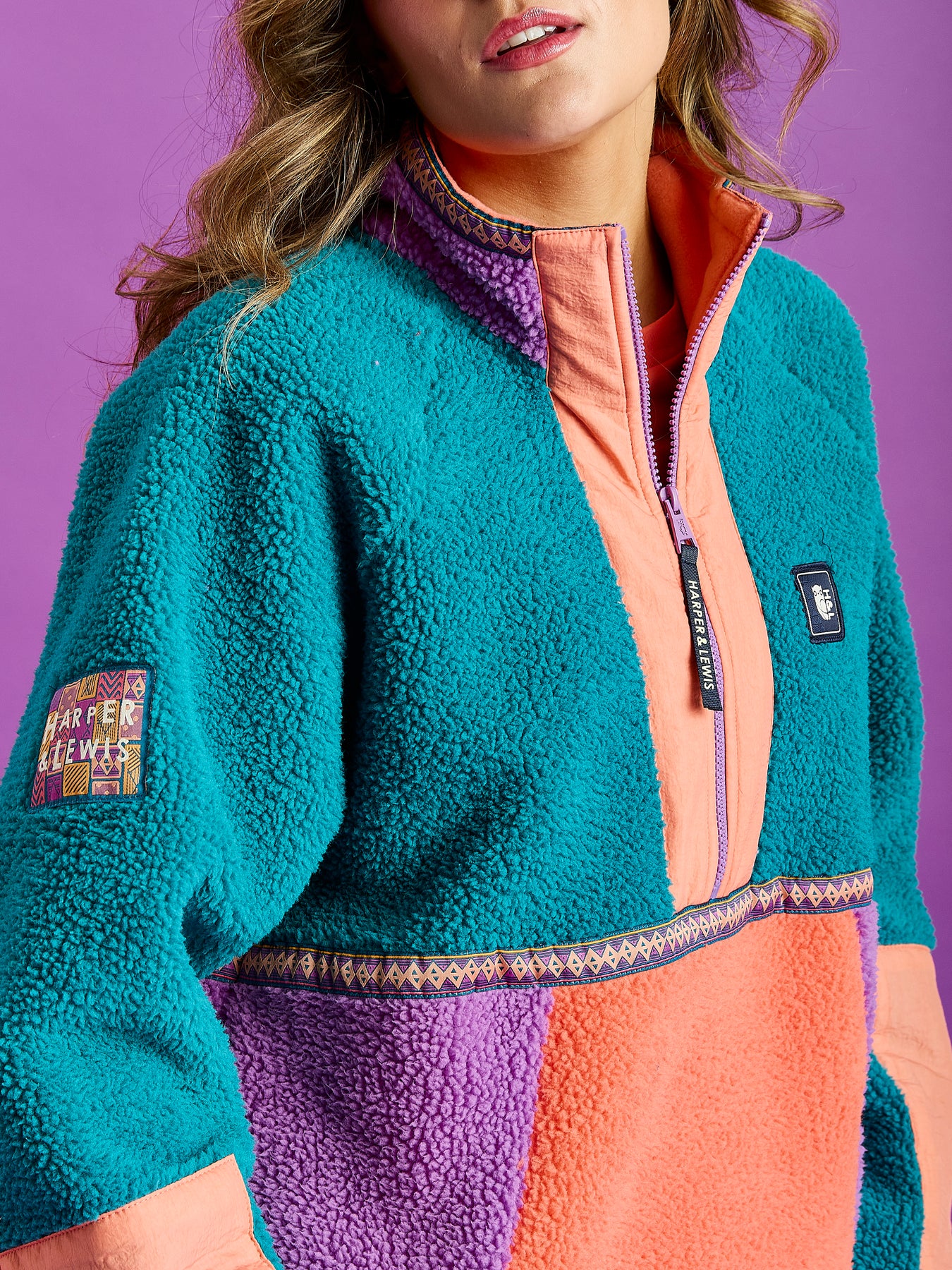 Transform your cool-weather wardrobe with this Colour Block Sherpa Fleece, presented in a stylish combination of Teal, Orchid & Deep Peach. This 1/2 zip fleece features a Deep  Peach crinkle woven placket at the front and sleeve panels, with the outer collar in a contrasting Orchid tone and a retro pattern detail tape across the chest & collar. It's crafted from 100% polyester Sherpa fleece, brushed on both sides for a soft, cosy feel inside and an additional layer of warmth outside. Details like a branded zip puller and navy branded woven badges on the chest and cuff add distinctive touches, Patch on the sleeve while Orchid elasticated binding at the cuffs and hem ensures a snug, comfortable fit.