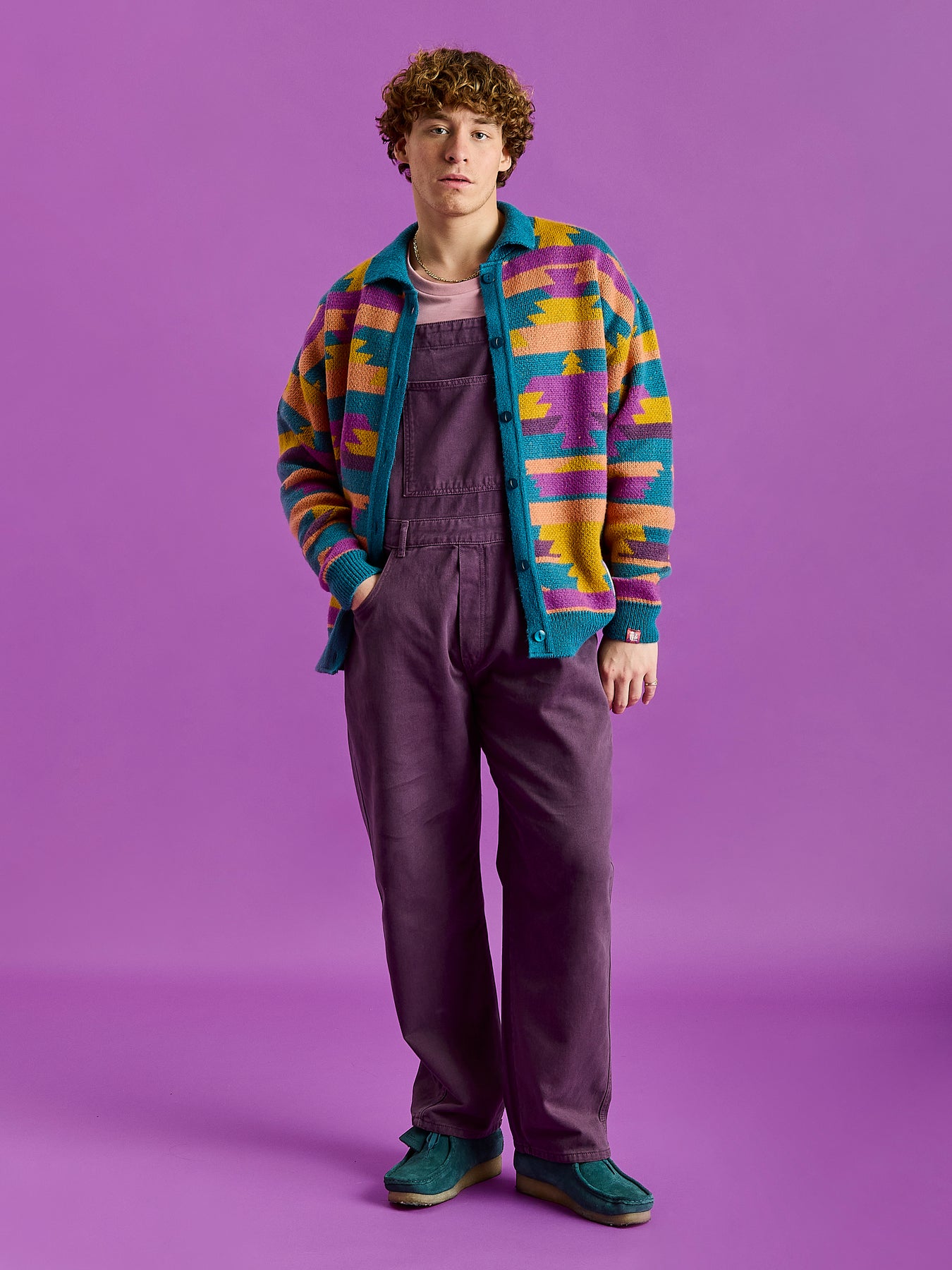 - Male Model is wearing Aria Dungarees in Deep Mulberry styled with Dana Knitted Jumper in Aztec Wave Pattern