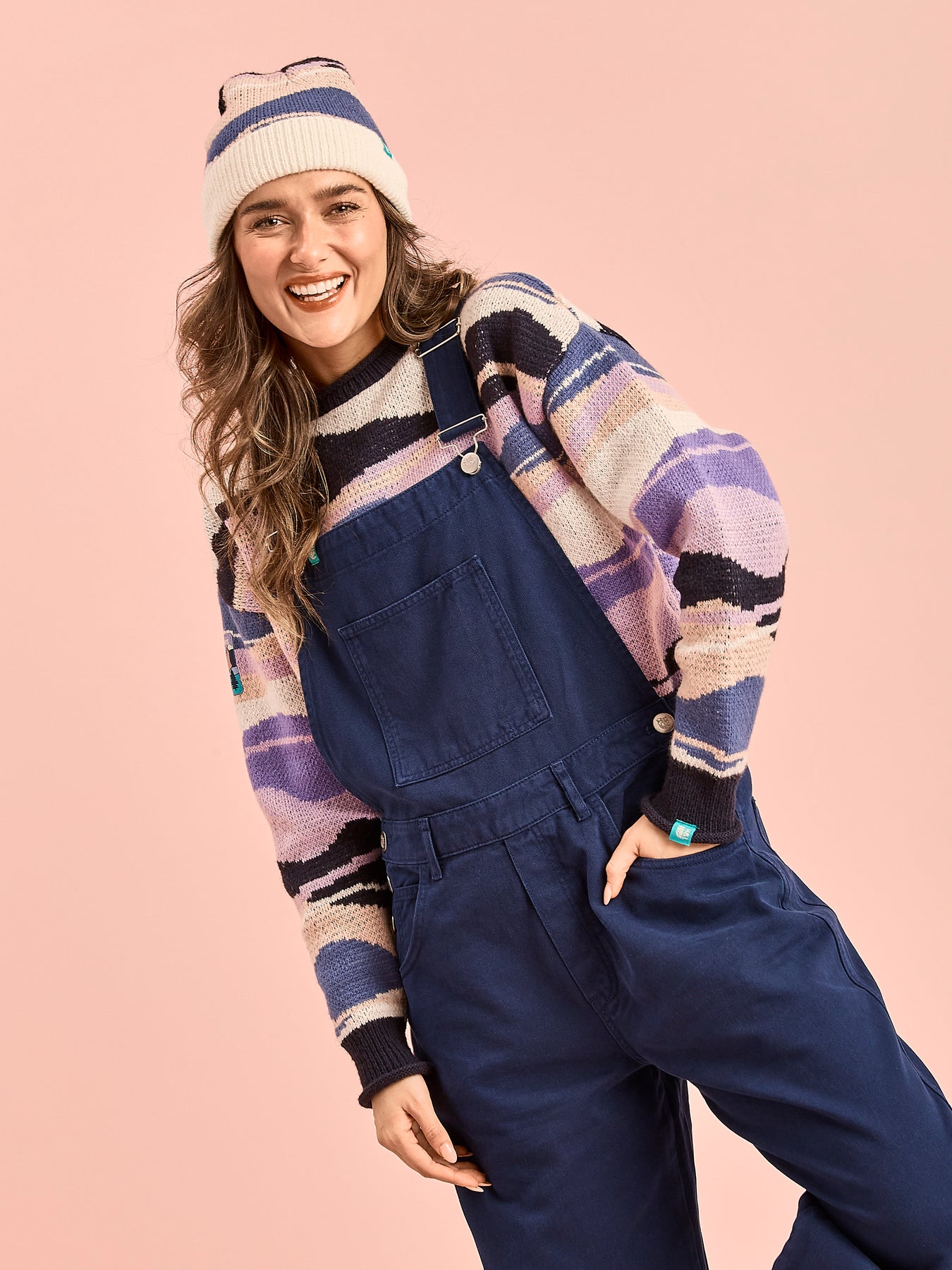 - Both models are wearing Aria Dungarees in Navy styled with Dana Knitted Jumper in Mountain wave pattern and Bodie Beanie