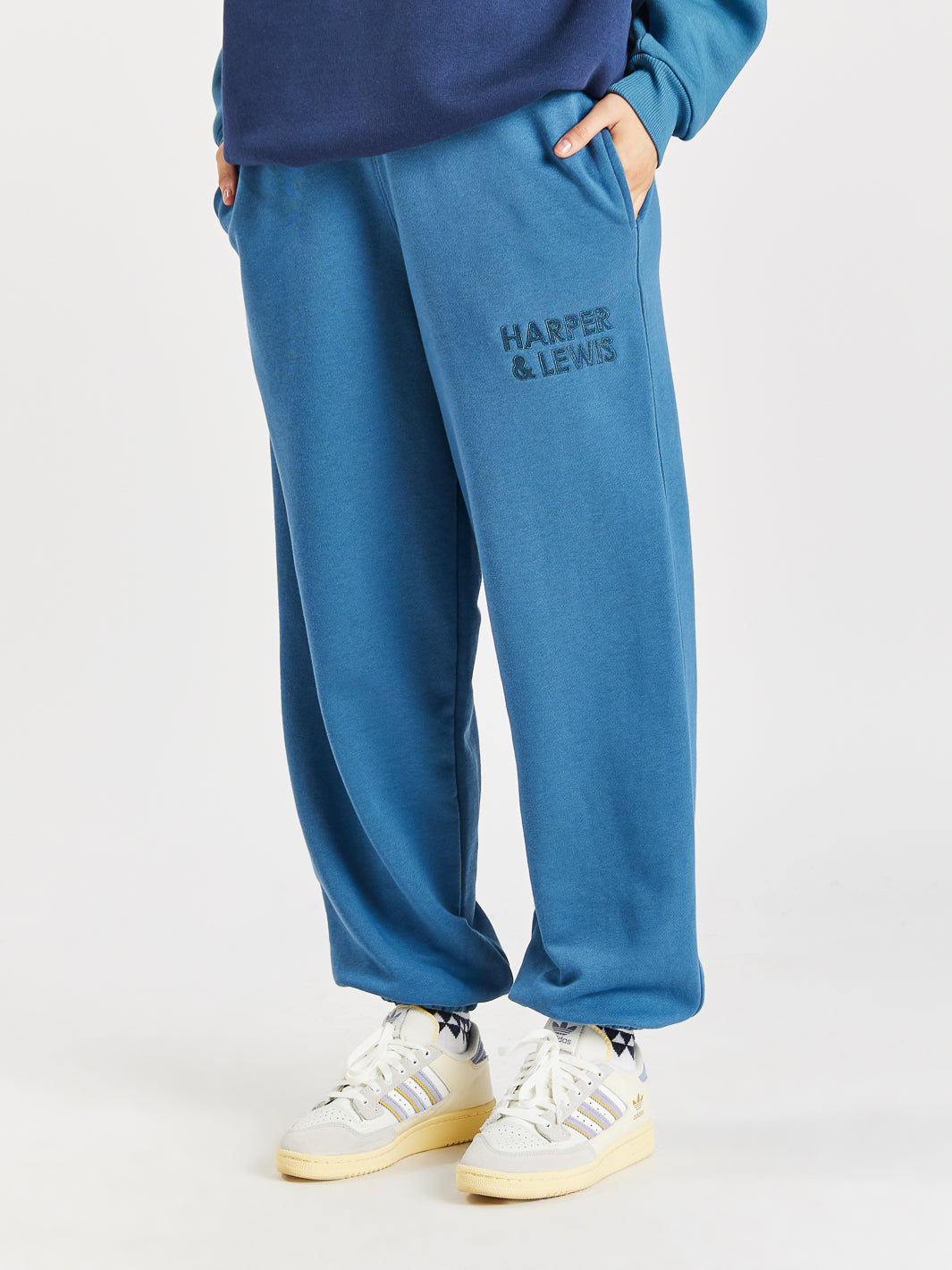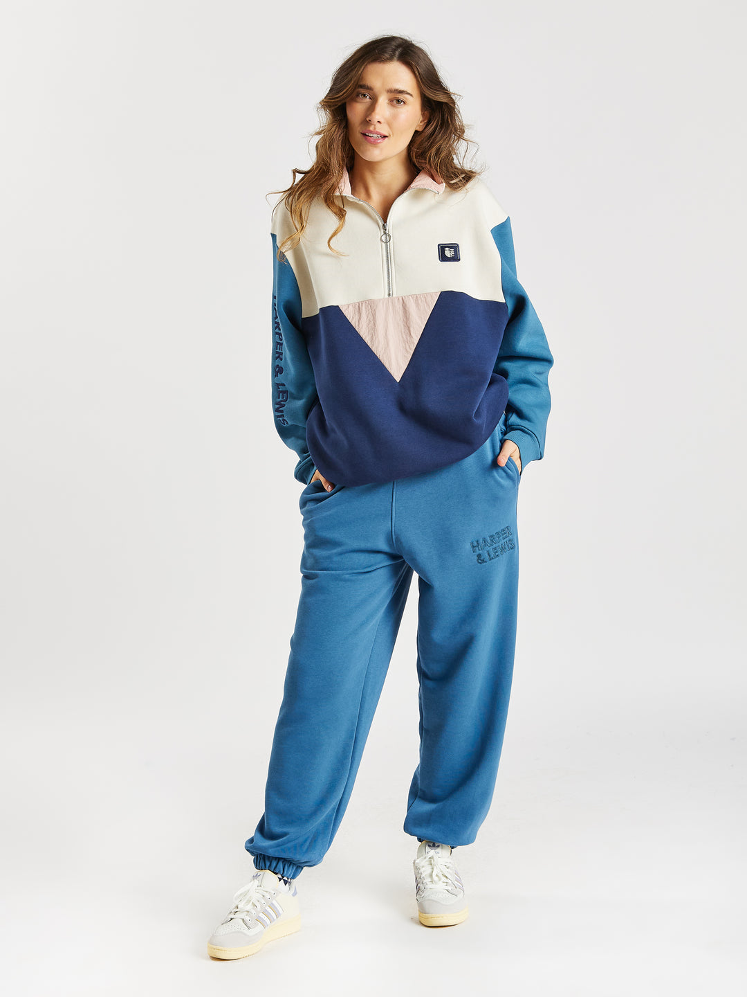 • Female Model is wearing Camille Sweatpants in Petrol styled with Ash 1/4 Zip Sweater