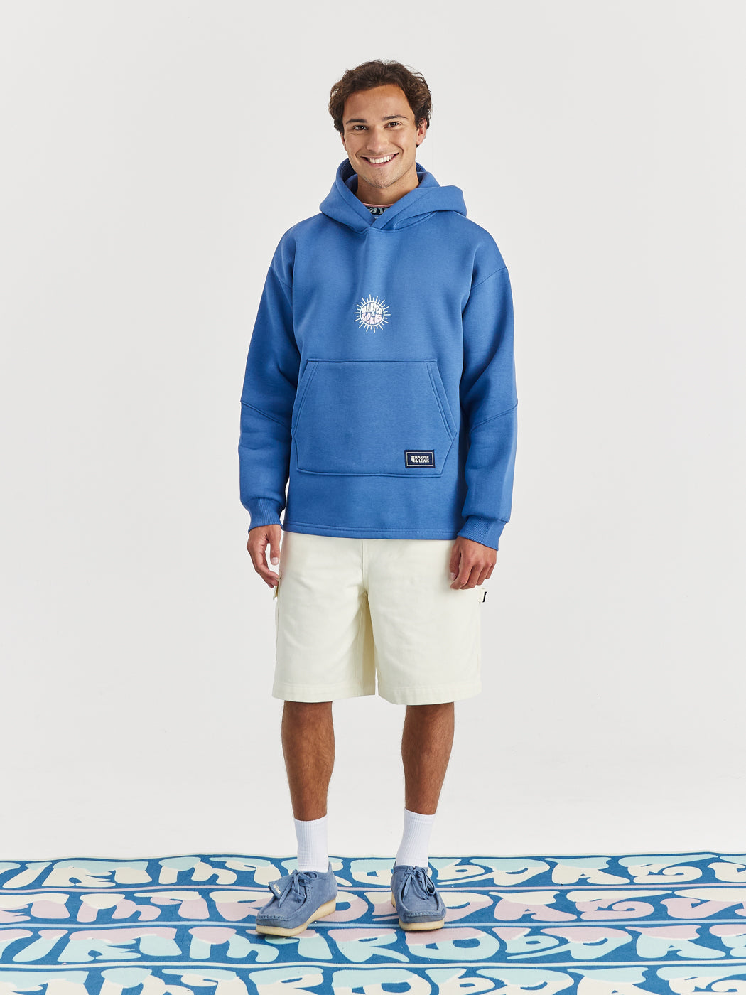 Male Model wearing the Cruz hoodie in Airforce Blue, featuring the Sun graphic on the centre of the front of the hoodie and released hem band.