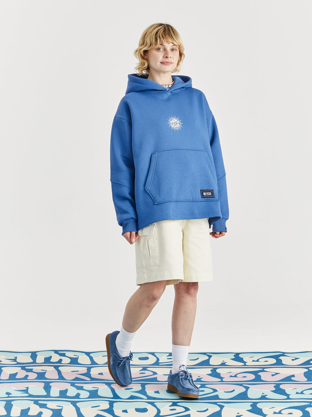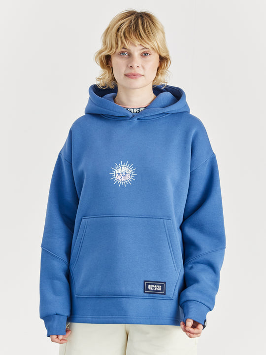 Female Model wearing the Cruz hoodie in Airforce Blue, featuring the Sun graphic on the centre of the front of the hoodie and showing the woven branded tab on the cuff of the sleeve.