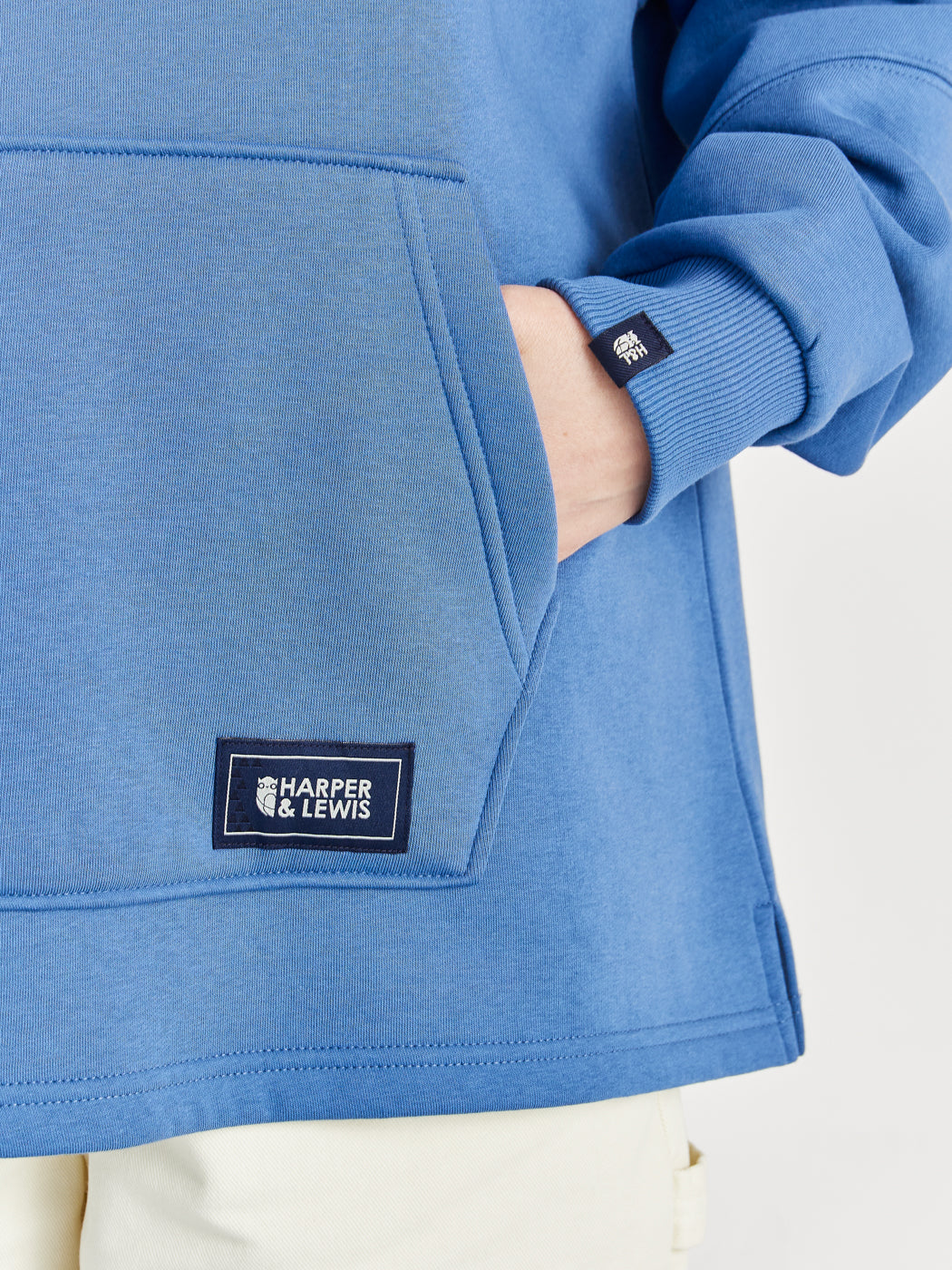 Details of the woven badges that are on the front kangaroo pocket and the left sleeve in navy.