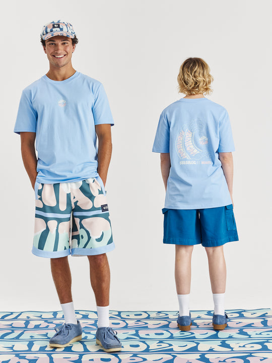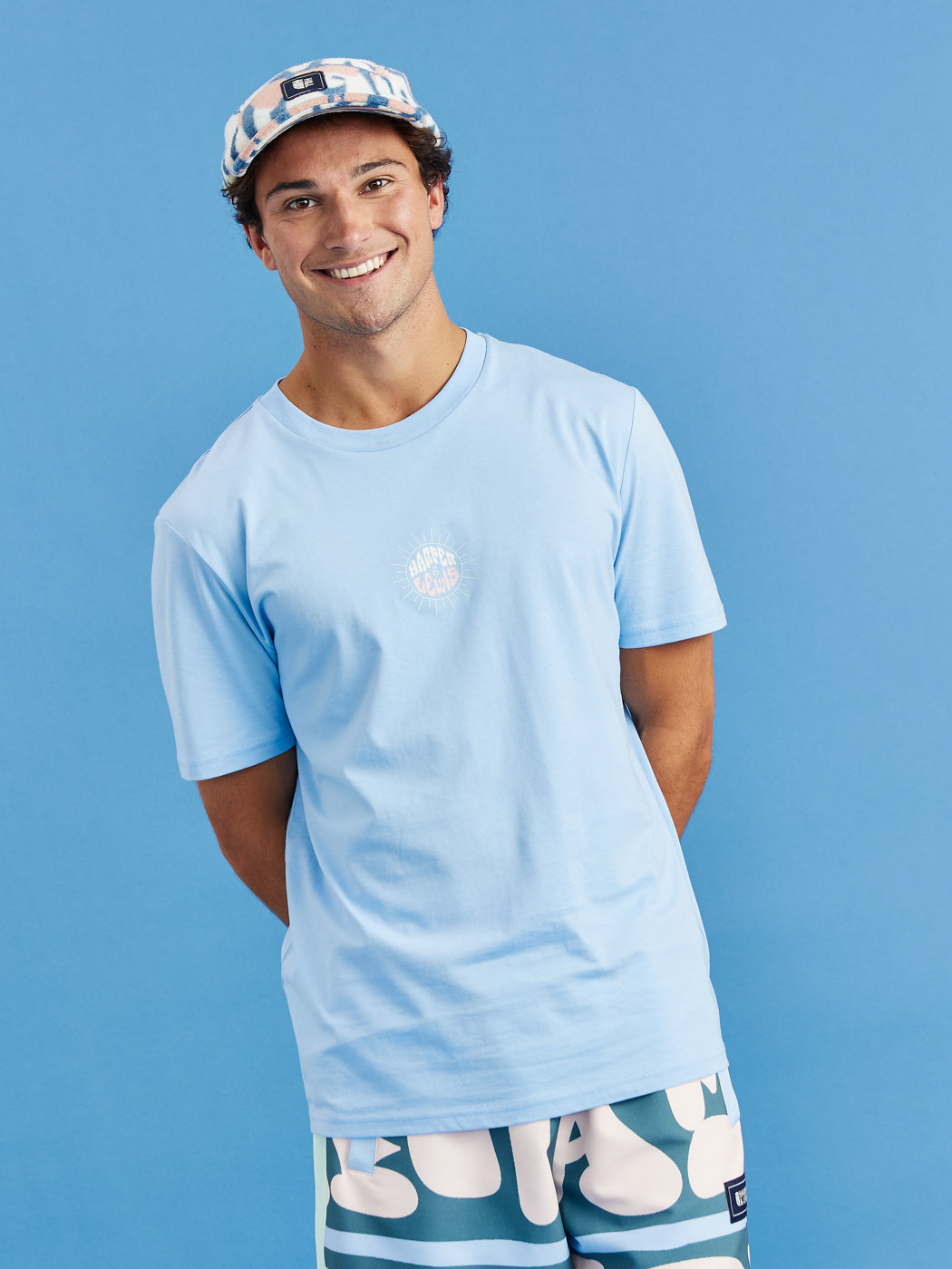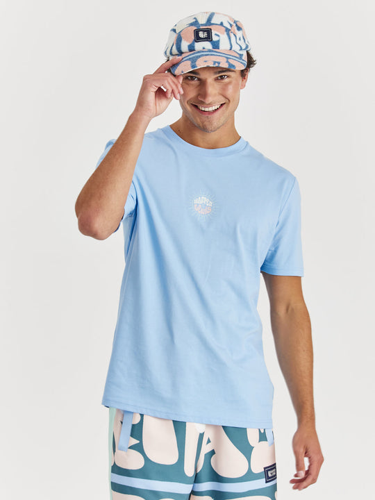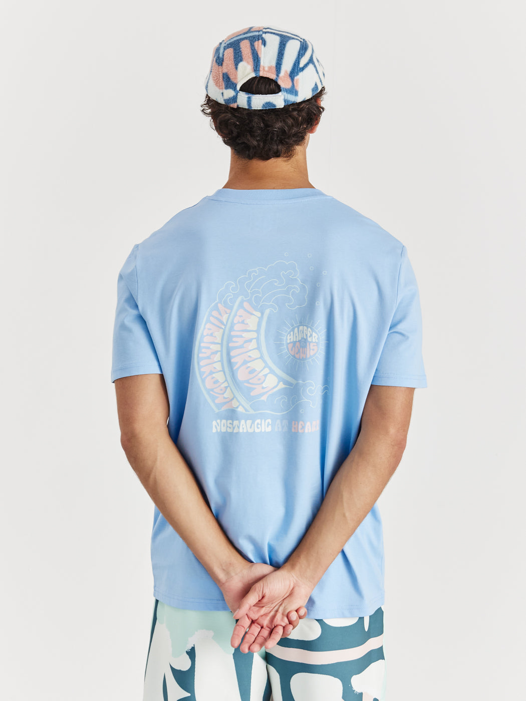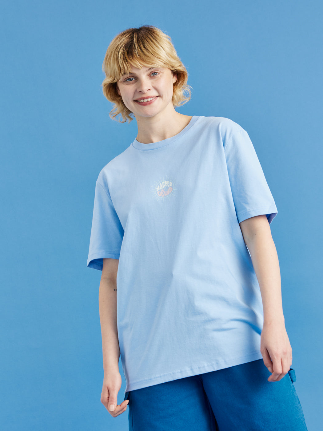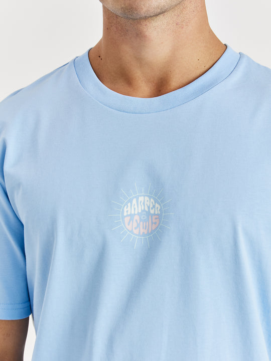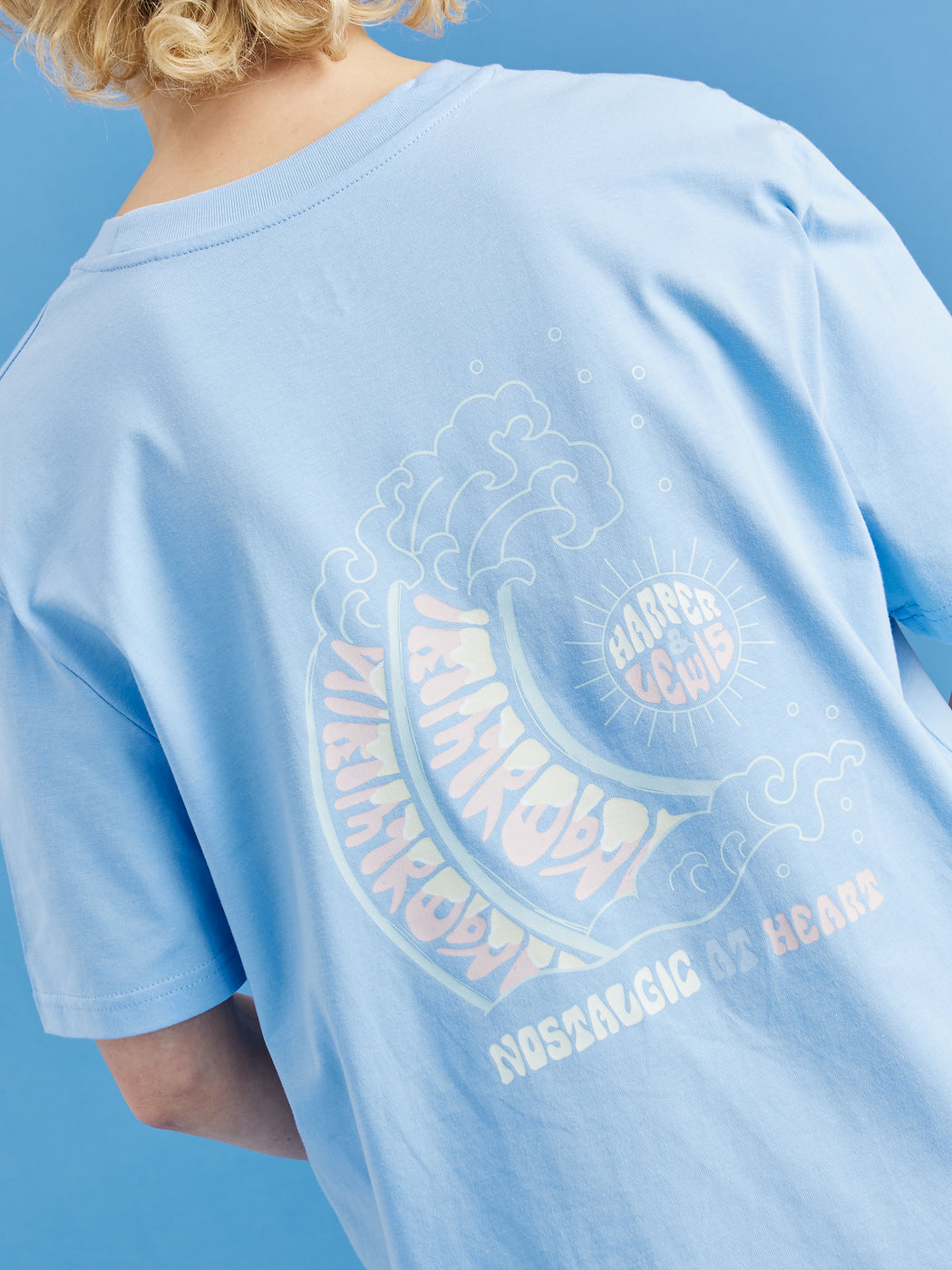 Step up your style game with the Maia Tee in Cornflower Blue. Perfect for any wardrobe, this essential t-shirt combines a timeless design with a retro twist. It features the Harper & Lewis print on the front and a captivating wave graphic on the back, adding a unique touch to the classic crew neck silhouette. Made from 100% cotton, this tee offers all-day comfort, whether it's layered or worn solo.